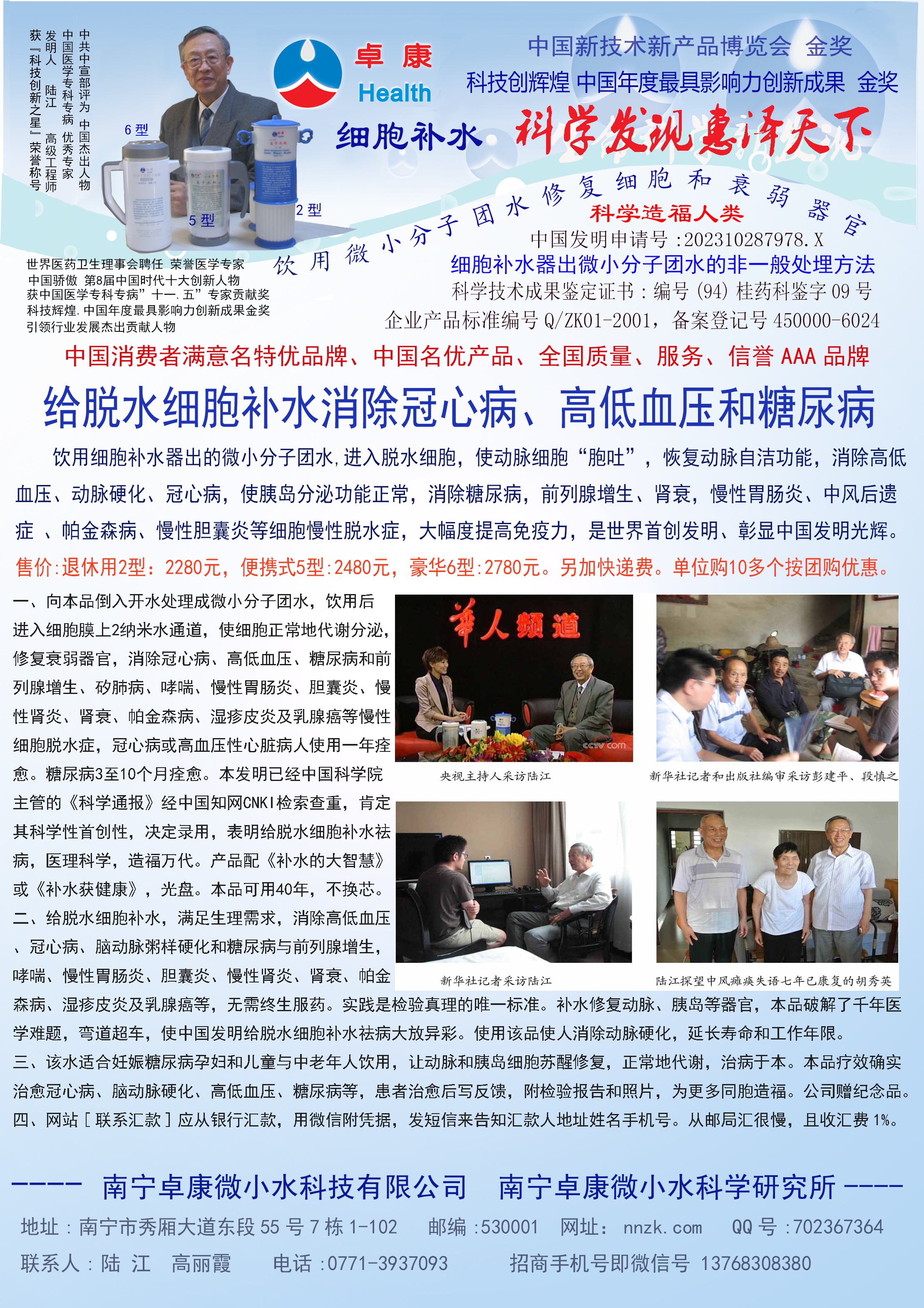 人類幾千年來患以上病癥需終生服藥,幾十年也不能治愈。可是我國南寧的高級工程師陸 江,于1990年想根治高血壓,研究發(fā)明了離子水瓶,處理出微小分子團水供飲用,經(jīng)過醫(yī)院臨床試用和專家鑒定,1999年獲中國發(fā)明專利權,產(chǎn)品于2000年投放市場后一直跟蹤調查,據(jù)全國各地用戶反饋:祛除了高低血壓、糖尿病和冠心病,并使前列腺增生、咽喉炎、鼻竇炎、慢性氣管炎、支氣管炎、矽肺病、哮喘、慢性胃炎、腸炎、慢性膽囊炎、慢性腎炎、腎衰、膀胱炎、便秘、痔瘡、風濕性關節(jié)炎和濕疹皮炎及中風后遺癥等病癥不藥而愈。為什么喝微小水能治20多種病?陸 江從1991年德國科學家發(fā)現(xiàn)細胞膜水通道僅為2納米獲得啟發(fā),認為多種器官患病是因細胞脫水,不能正常代謝和分裂增殖,才使器官細胞減少致衰弱萎縮而形成細胞缺水性病癥。22年來的實踐有力地支持了“細胞脫水致病”這一重要論點,表明喝微小水可滿足細胞的生理需求,補水就能祛病,是生命科學新亮點。